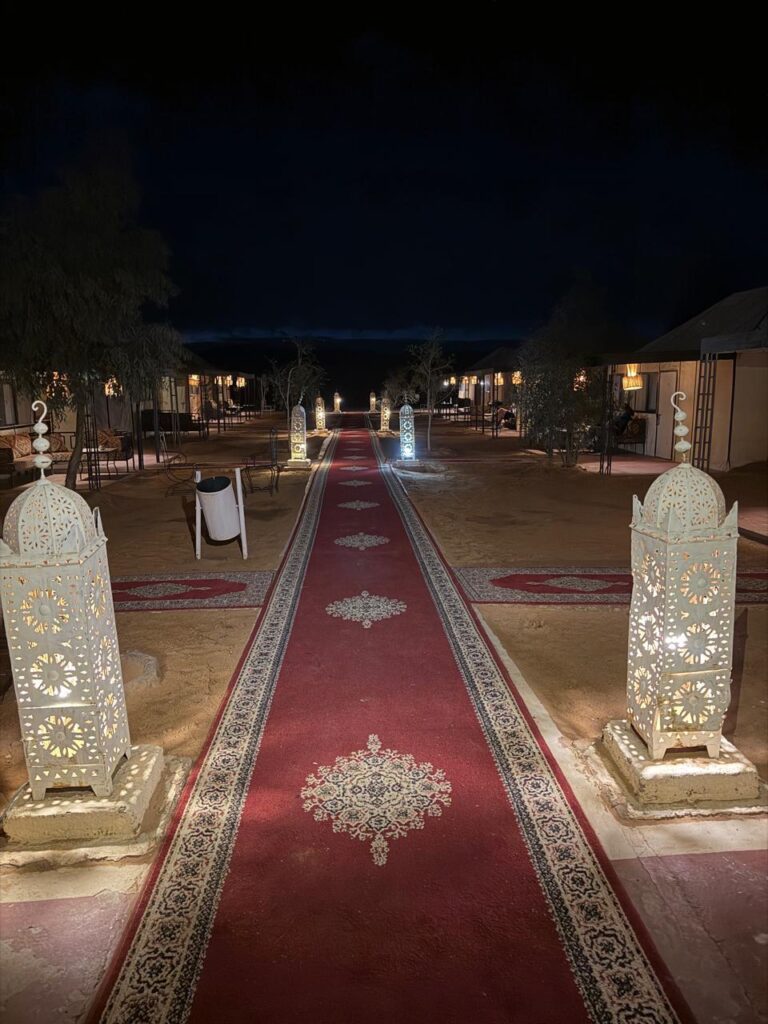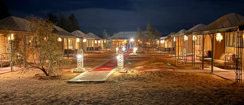Allí el ruido del mundo desaparece. Paseo en dromedario al crepúsculo, hoguera ancestral y música sagrada bajo las estrellas. Dos noches en haimas de lujo bajo el cielo más estrellado del planeta.